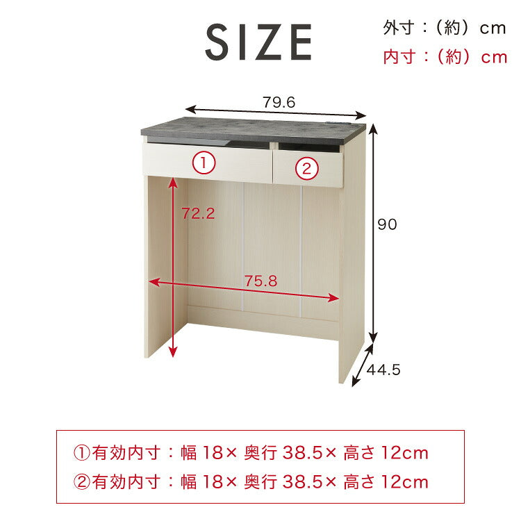 幅79.6×奥行44.5cm(約)の広々とした天板。耐荷重約30kgなので、調理家電なども設置可能。天板右奥に2口コンセント、背面側に配線孔が付いています。