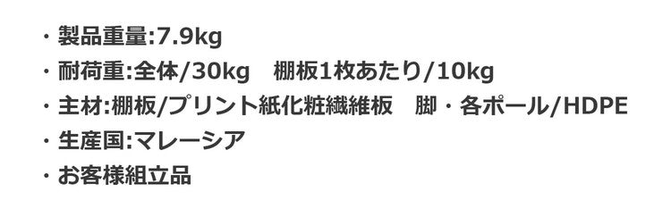 ・耐荷重(約):全体/30kg 棚板1枚あたり/10kg