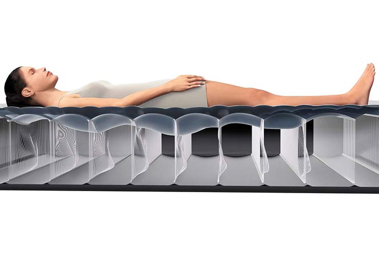 ○ベッド内部に高強度ポリエステル繊維Fiber-Tech?が数千本張り巡らされている為、体の凹凸をなぞるように包み込み体圧分散が取れ、心地良く快適な睡眠をとる事ができます。