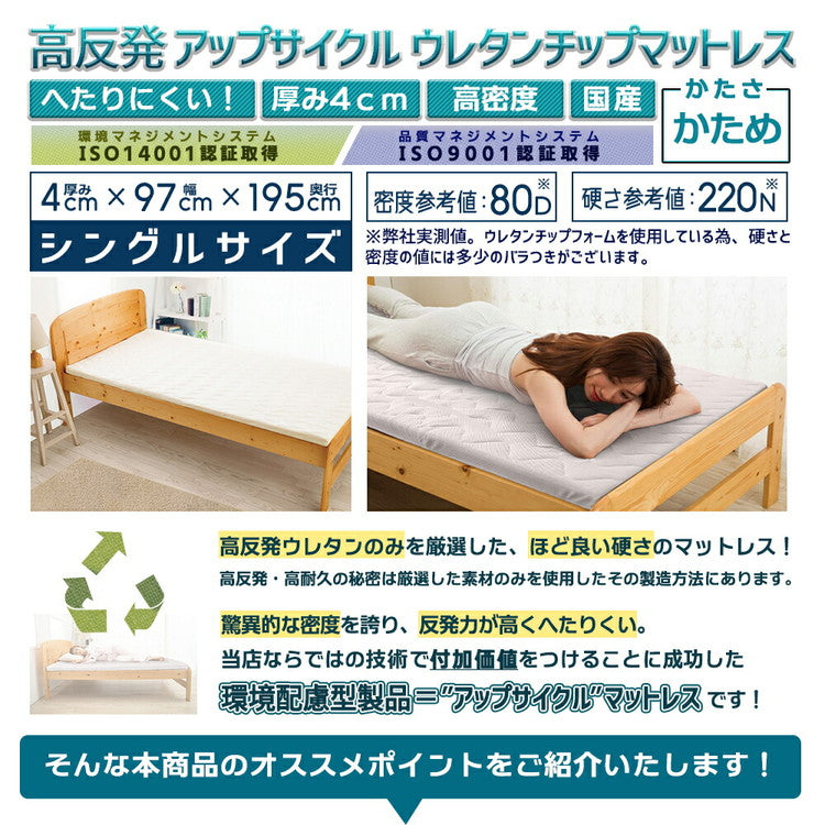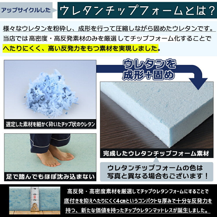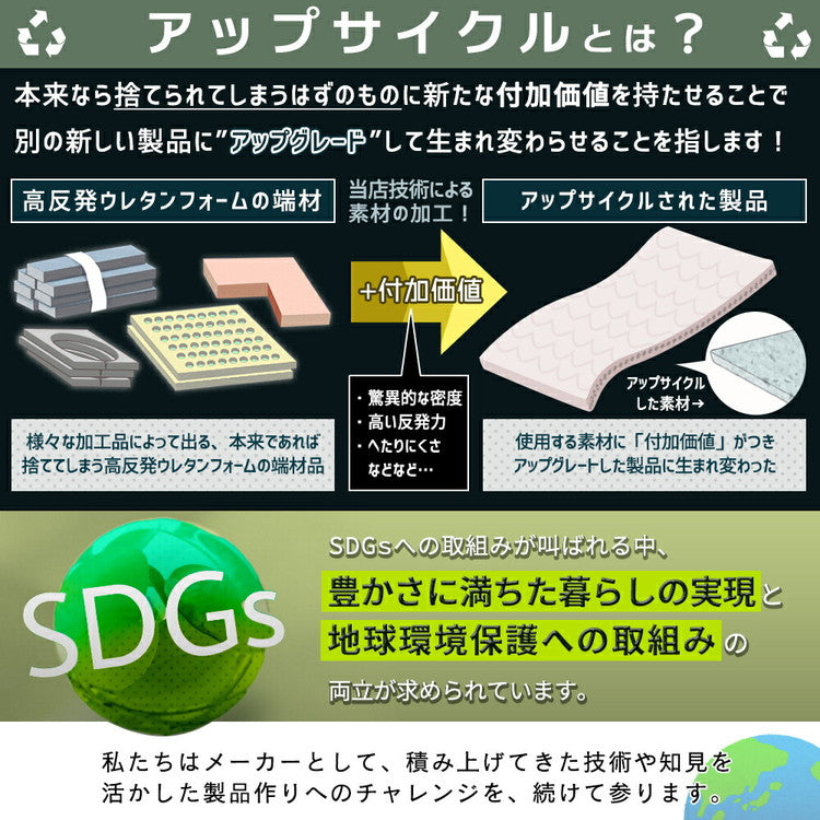 本商品は高密度・高反発素材のみを厳選してチップフォーム化することで様々な付加価値をつけることに成功した環境配慮型製品=”アップサイクル”マットレスです!