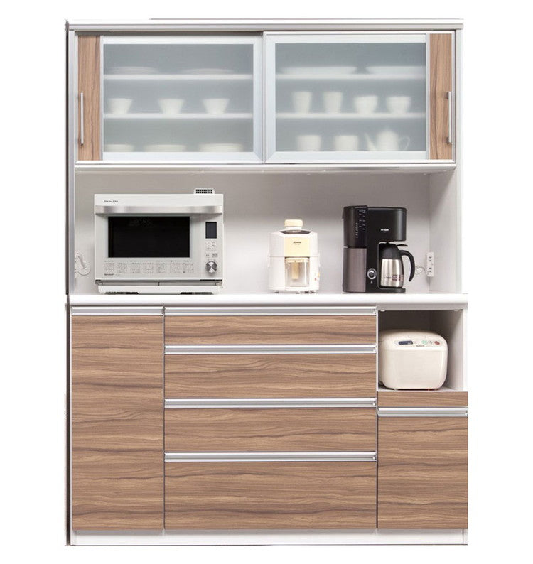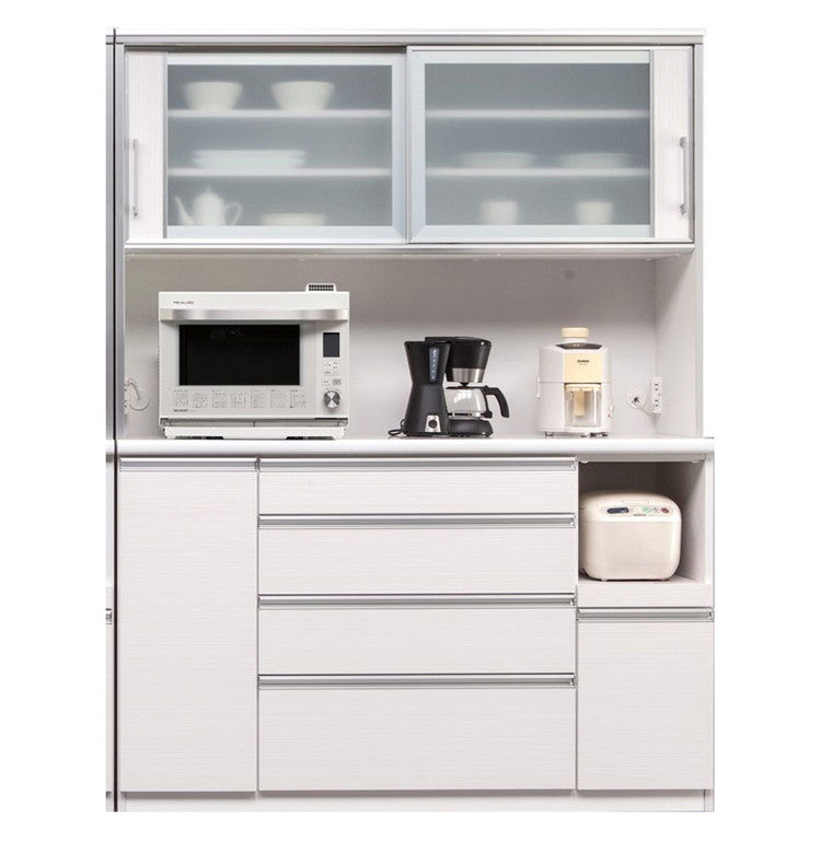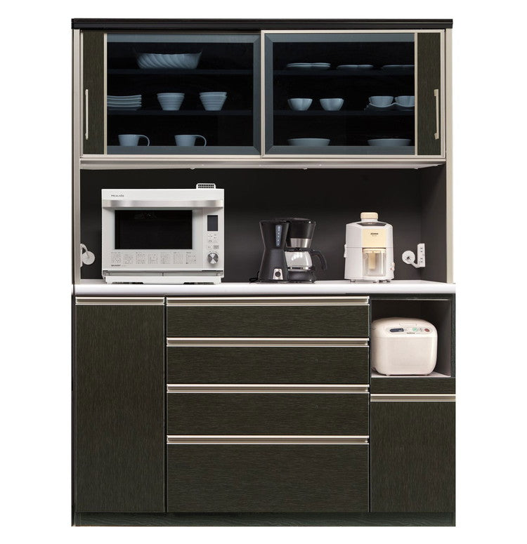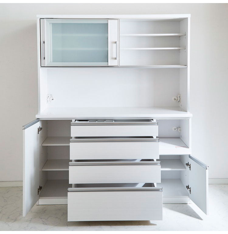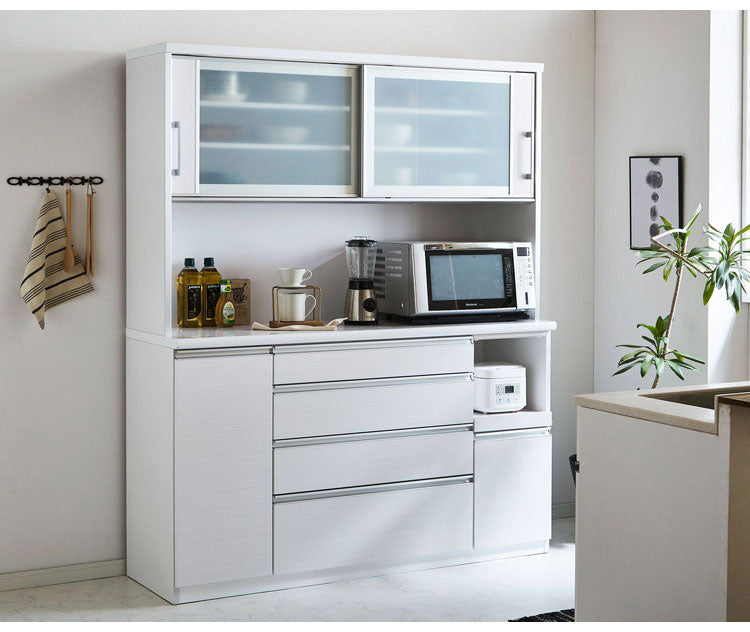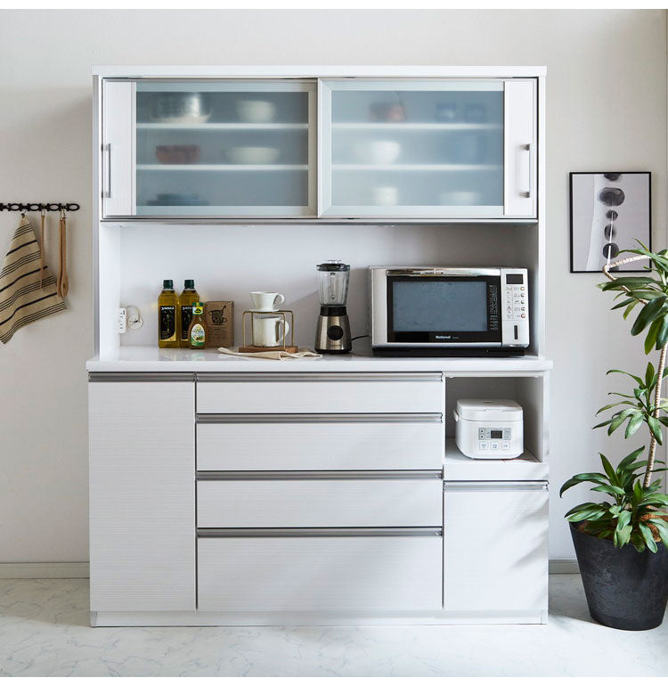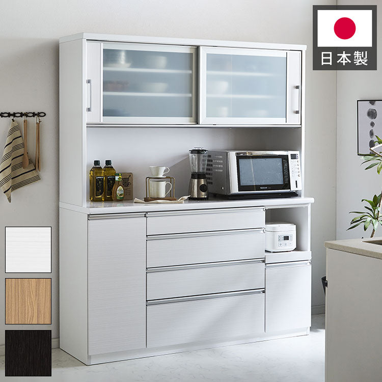 食器棚 キッチンボード 幅150 奥行48 高さ200 完成品 国産 モイス加工 レンジ台 レンジボード 大容量 キッチン 収納 木目 フルオープンレール ホワイト 白 ブラック キングウッド(代引不可)