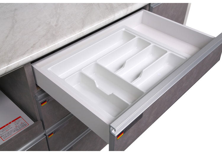 開き扉と上から1・2段目の引出はソフトクローズ機能付き、家電収納スペースの上部はモイス材を設置しております。