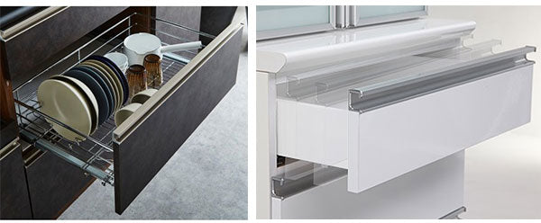 引出全段(4杯)ソフトクローズ機能付き(上から2段目のワイヤーラック式引出以外の3杯はヘティヒ社製イノテックレールを使用)、家電収納スペースの上部はモイス材を設置しております