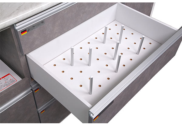 引出全段(5杯)ソフトクローズ機能付き(ヘティヒ社製クアドロレールを使用)、家電収納スペースの上部はモイス材を設置しております