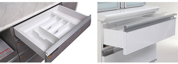 引出はソフトクローズ機能付き(へティヒ社製イノテックレールを使用、耐荷重30kg)、開き戸はソフトクローズ機能付き
