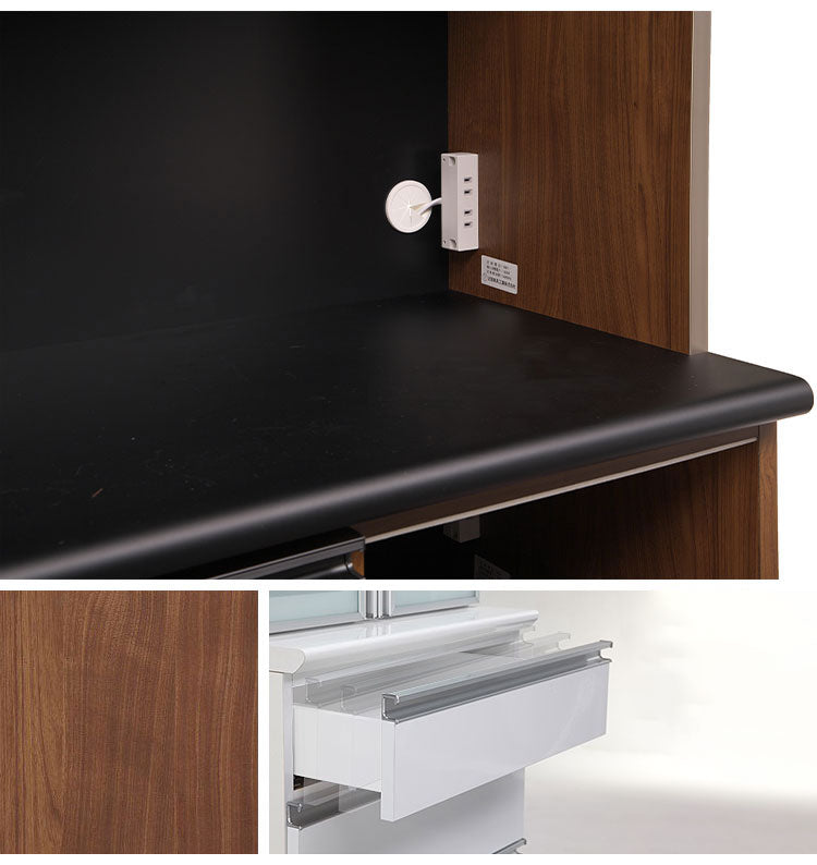 開き扉と引出全段ソフトクローズ機能付き、家電収納スペースの上部はモイス材を設置しております。