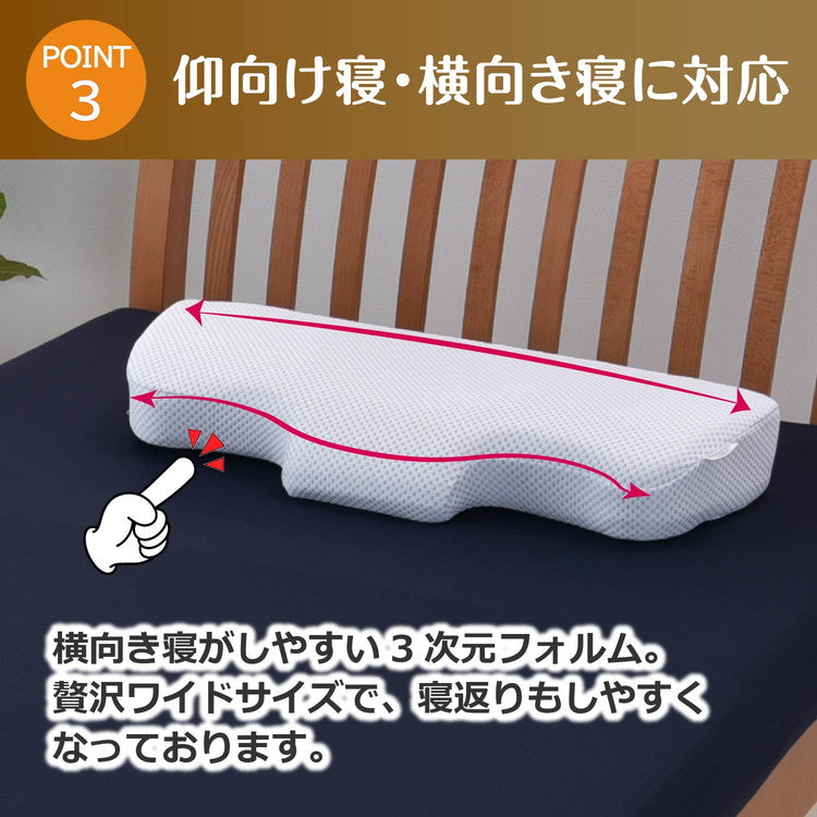 横向き寝の際は、肩がはまるような形状で、ワイドサイズなので寝返りも打ちやすくしています。