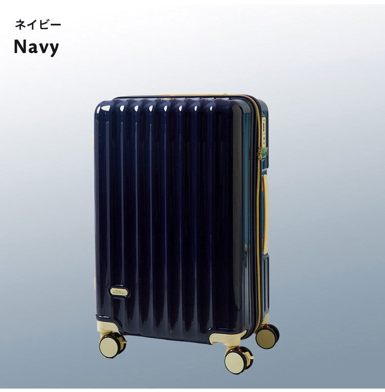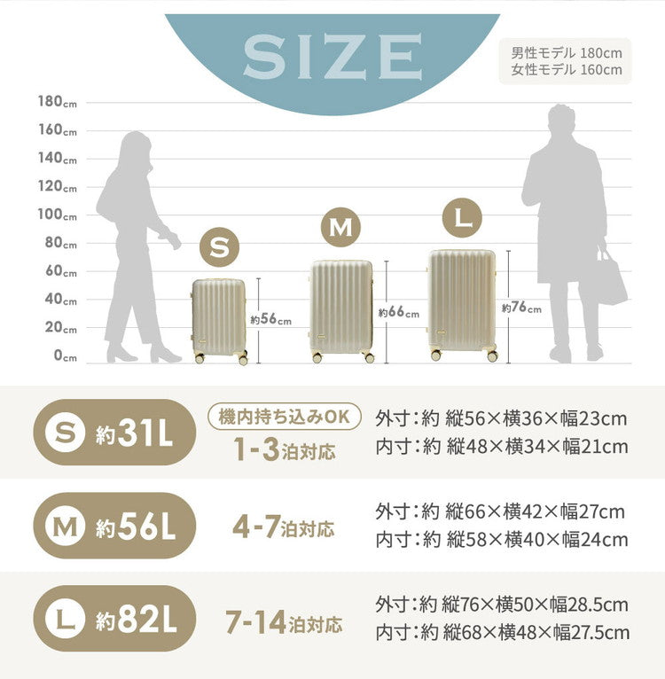 ファスナータイプ、Sサイズのみ機内持込可、ナンバーロック式(鍵の付属無し)、ドリンクホルダー、ストッパー付きキャスター