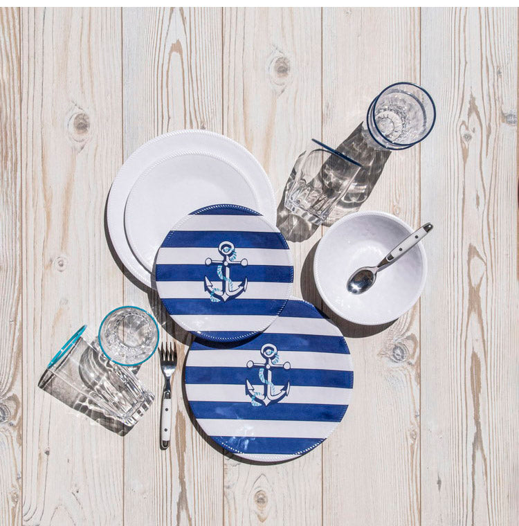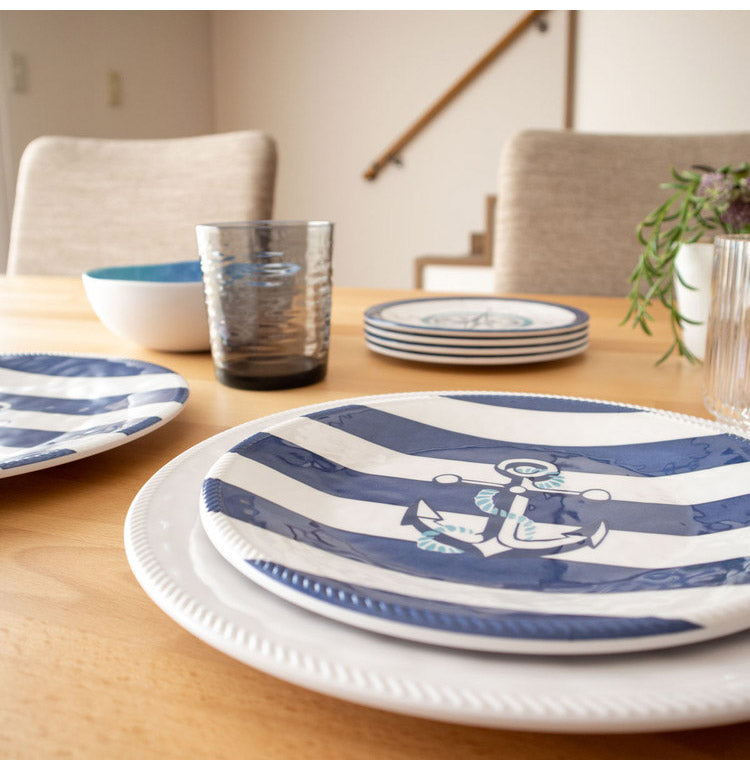 マリンボーダー柄に錨をデザインした爽やかな海を感じるメラミン食器です