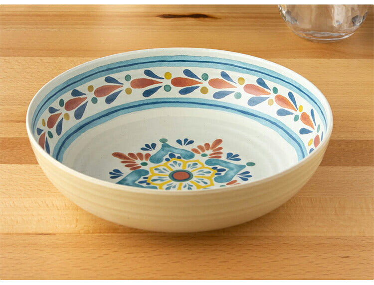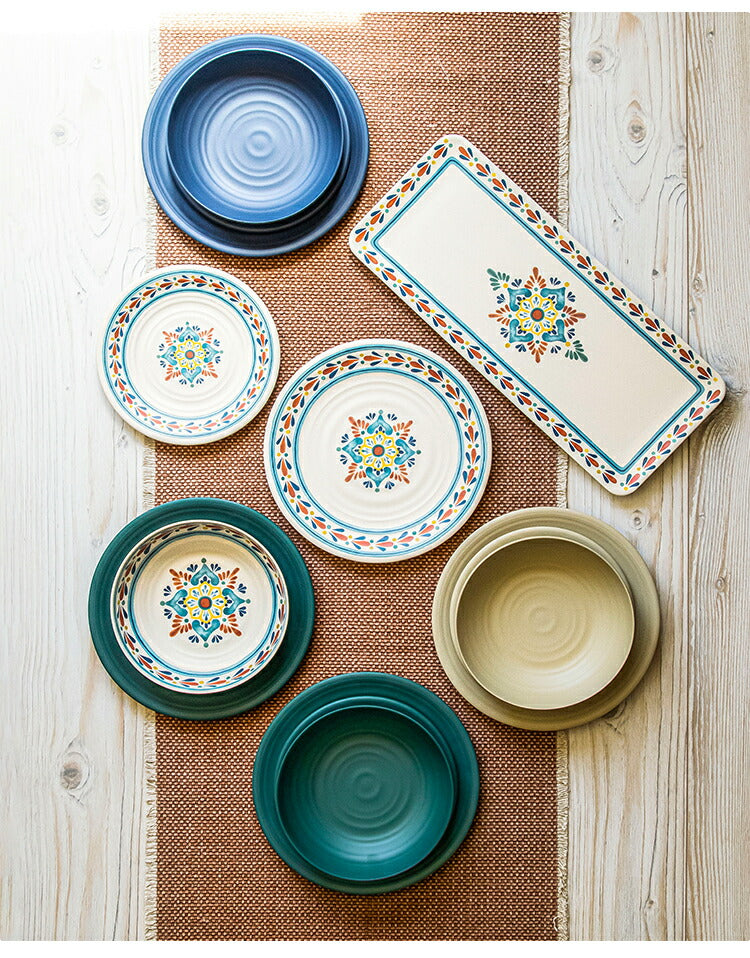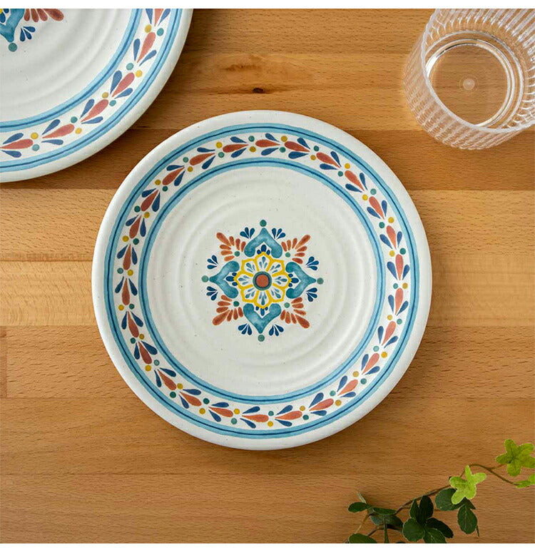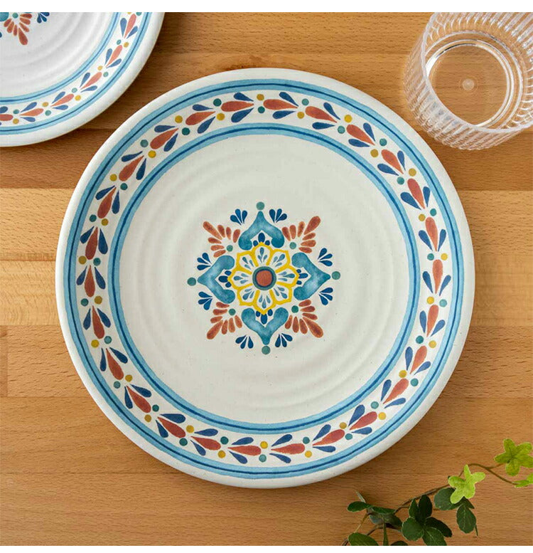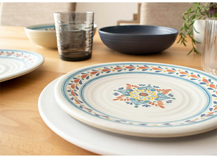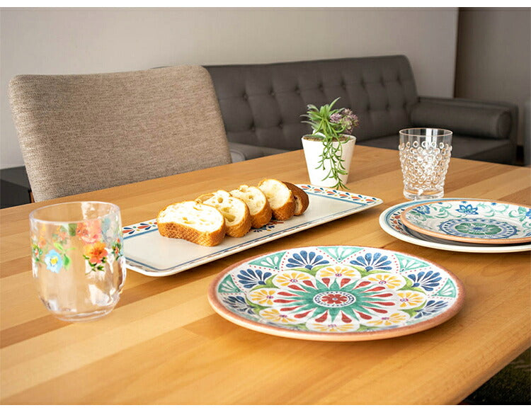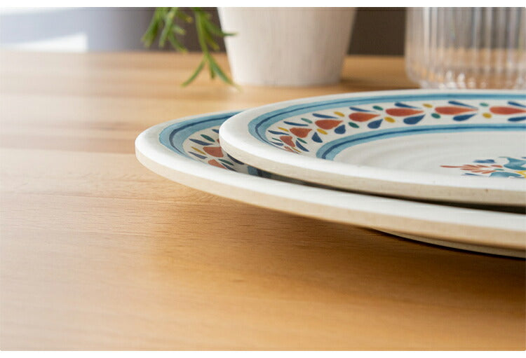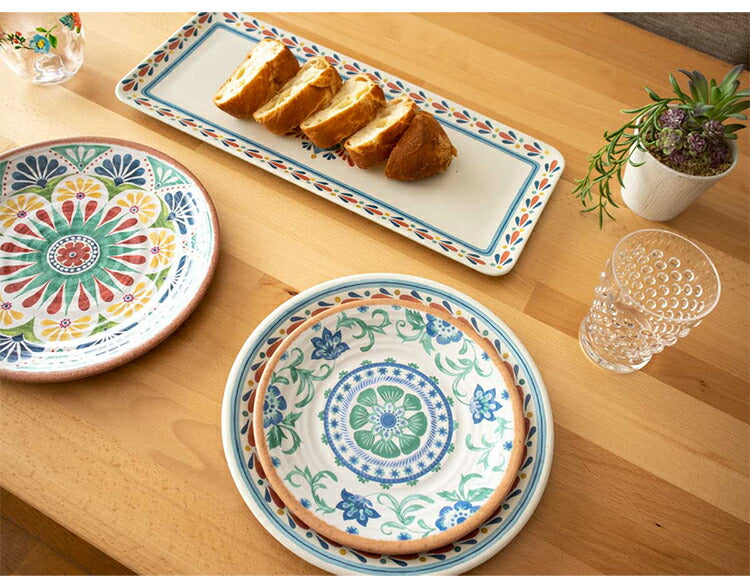 ハンドメイド風で南欧デザインが特徴のメラミン食器です。自然のモチーフをパッチワークのように組み合わせたユーモラスなデザインです