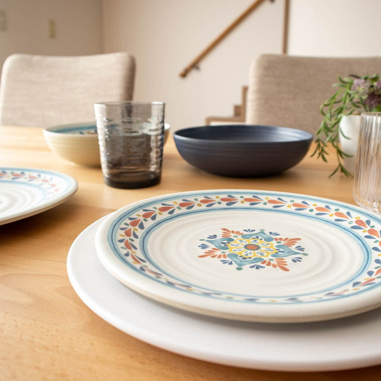 ハンドメイド風で南欧デザインが特徴のメラミン食器です。自然のモチーフをパッチワークのように組み合わせたユーモラスなデザインです