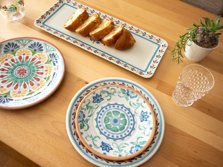 ハンドメイド風で南欧デザインが特徴のメラミン食器です。自然のモチーフをパッチワークのように組み合わせたユーモラスなデザインです