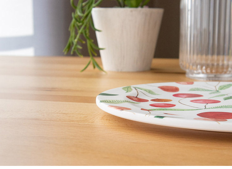 メラミン食器は「メラミン樹脂」というプラスチックを素材とした食器です。食器の日常使いに非常に適しており、軽くて丈夫、割れにくくて汚れが落としやすいです。メラミンは熱いものを入れても熱伝導率が低いので、熱々の料理を入れても食器自体が熱くなりにくく、持ちやすいです。また、他のプラスチック樹脂よりも硬度が高いため、食器に傷がつきにくく長く使用いただけます。