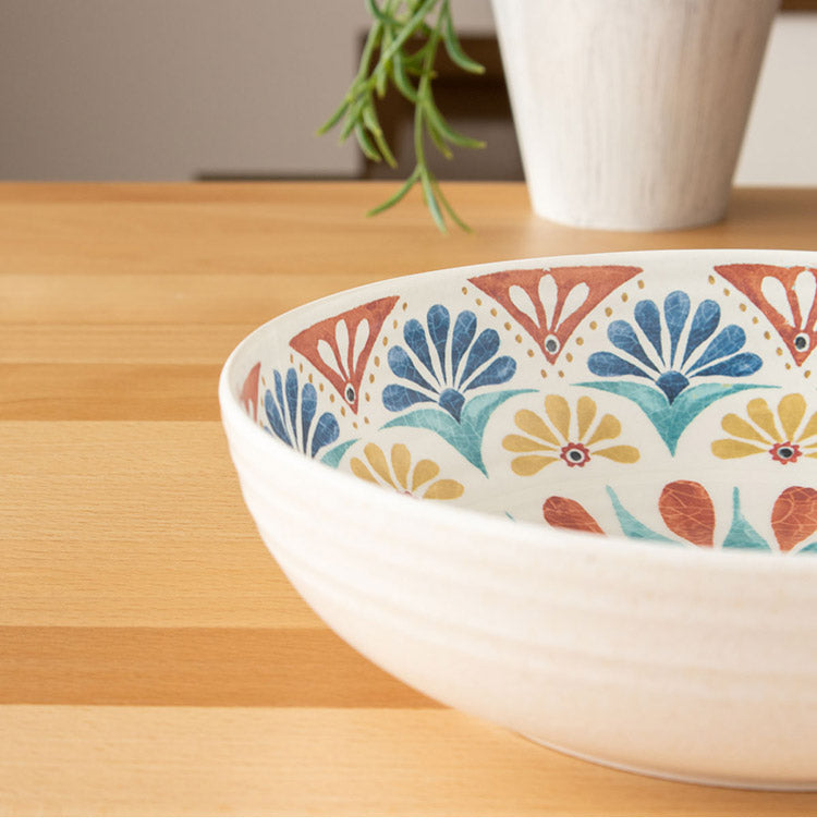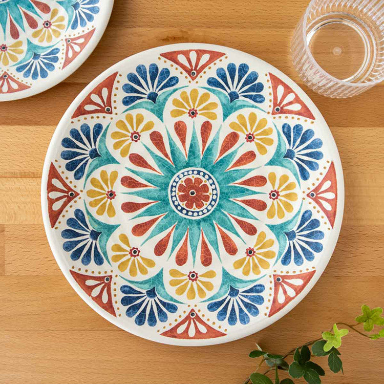 ハンドメイド風で南欧デザインが特徴のメラミン食器です。自然のモチーフをパッチワークのように組み合わせたユーモラスなデザインです