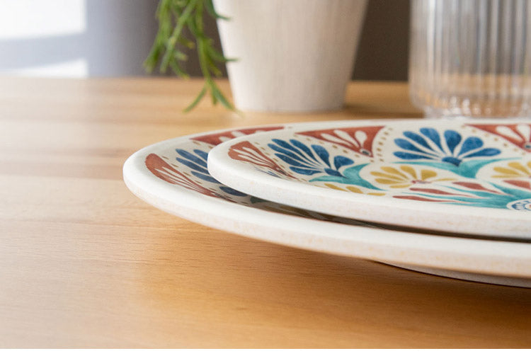 メラミン食器は「メラミン樹脂」というプラスチックを素材とした食器です。食器の日常使いに非常に適しており、軽くて丈夫、割れにくくて汚れが落としやすいです。メラミンは熱いものを入れても熱伝導率が低いので、熱々の料理を入れても食器自体が熱くなりにくく、持ちやすいです。また、他のプラスチック樹脂よりも硬度が高いため、食器に傷がつきにくく長く使用いただけます。
