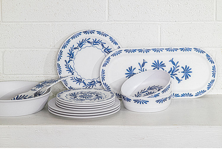 ホワイトベースにブルーのプラントデザインが特徴のメラミン食器です。青磁をイメージしたヨーロッパスタンダードデザインです