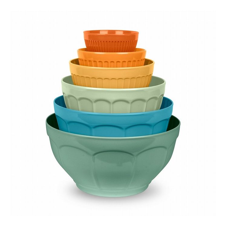 マルチカラーで高さのあるメラミン製ミキシングボウル6個セットです。スタッキングできる6個のボウル全てが違うカラーで毎日のお料理が楽しくなります