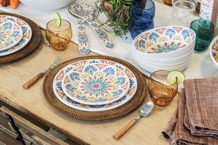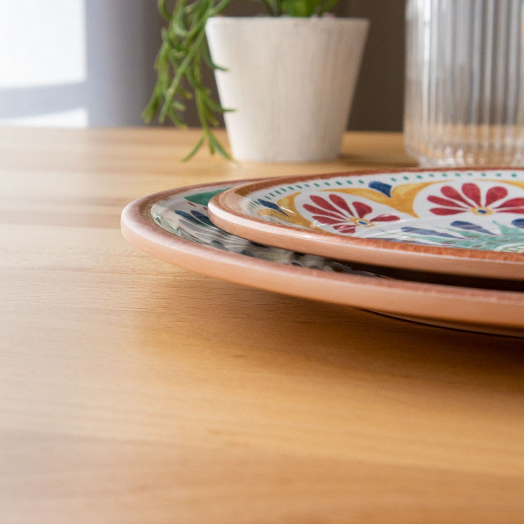 ハンドメイド風で南欧デザインが特徴のメラミン食器です。自然のモチーフをパッチワークのように組み合わせたユーモラスなデザインです