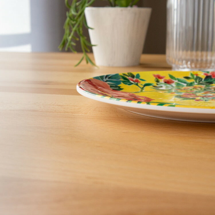 メラミン食器は「メラミン樹脂」というプラスチックを素材とした食器です。食器の日常使いに非常に適しており、軽くて丈夫、割れにくくて汚れが落としやすいです。メラミンは熱いものを入れても熱伝導率が低いので、熱々の料理を入れても食器自体が熱くなりにくく、持ちやすいです。また、他のプラスチック樹脂よりも硬度が高いため、食器に傷がつきにくく長く使用いただけます。