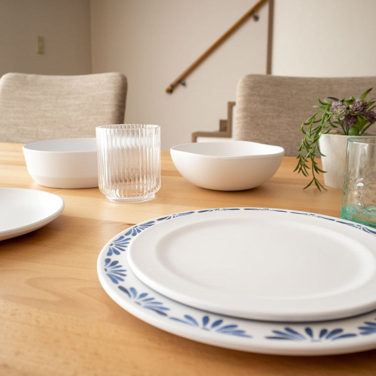 メラミン食器は「メラミン樹脂」というプラスチックを素材とした食器です。食器の日常使いに非常に適しており、軽くて丈夫、割れにくくて汚れが落としやすいです。メラミンは熱いものを入れても熱伝導率が低いので、熱々の料理を入れても食器自体が熱くなりにくく、持ちやすいです。また、他のプラスチック樹脂よりも硬度が高いため、食器に傷がつきにくく長く使用いただけます。