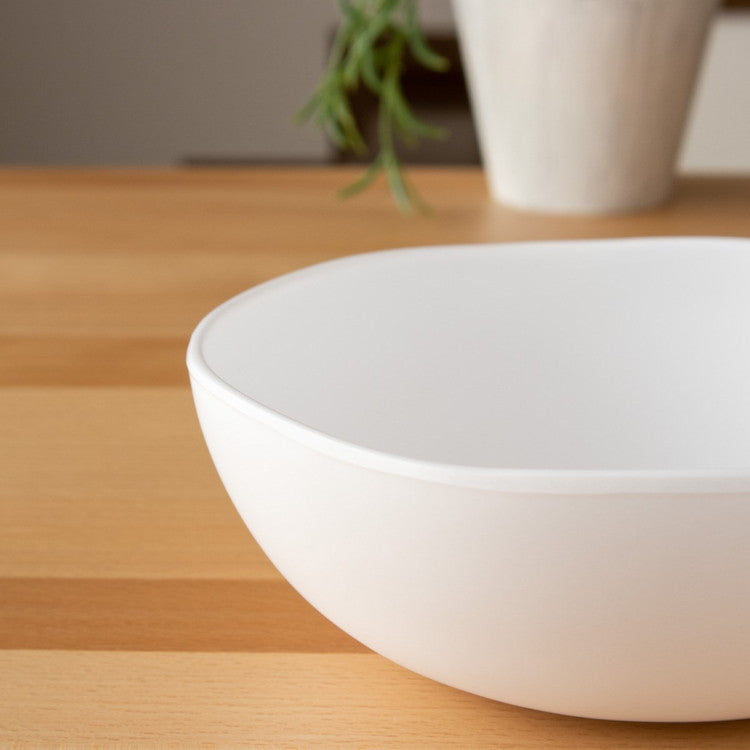 メラミン食器は「メラミン樹脂」というプラスチックを素材とした食器です。食器の日常使いに非常に適しており、軽くて丈夫、割れにくくて汚れが落としやすいです。メラミンは熱いものを入れても熱伝導率が低いので、熱々の料理を入れても食器自体が熱くなりにくく、持ちやすいです。また、他のプラスチック樹脂よりも硬度が高いため、食器に傷がつきにくく長く使用いただけます。
