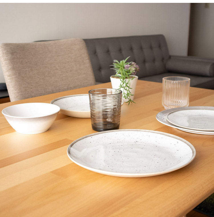 自然な斑点が有る磁器の風合いを模したシックなメラミン食器です