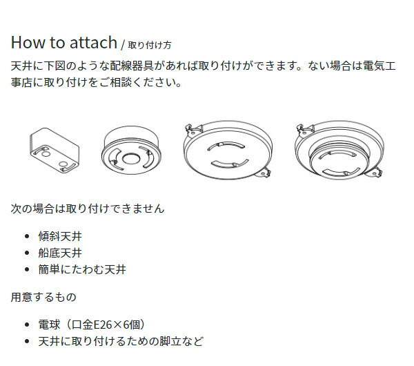 ●対応電球:E26 60Wまで×6(LED対応)電球別売