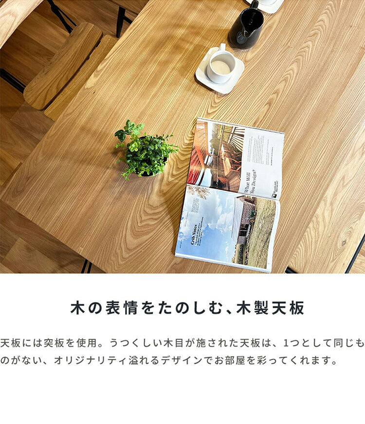 テーブルは天然木の天板と、ブラックのアイアン脚とのコントラストが特徴的!