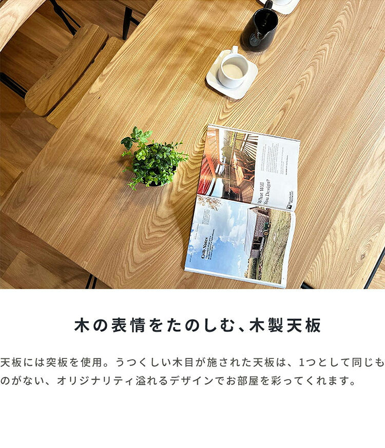 天然木の天板と、ブラックのアイアン脚とのコントラストが特徴的なダイニングテーブル。