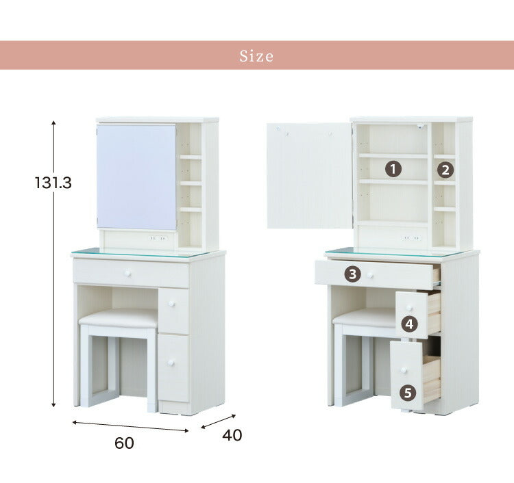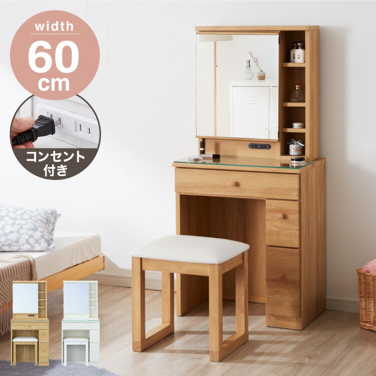 ドレッサー、デスク、一面鏡、幅60cm、完成品、かわいい、収納、コンセント付き、スツール付き、椅子付き、ガラス天板、棚付き、北欧、モダン、おしゃれ、コンパクト、化粧台、メイク台、引き出し、姫系、鏡台、1面鏡、可愛い、白、ホワイト、ナチュラル、フレンチ、カントリー