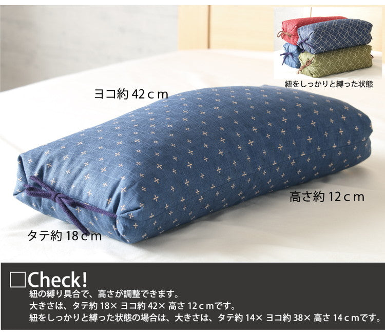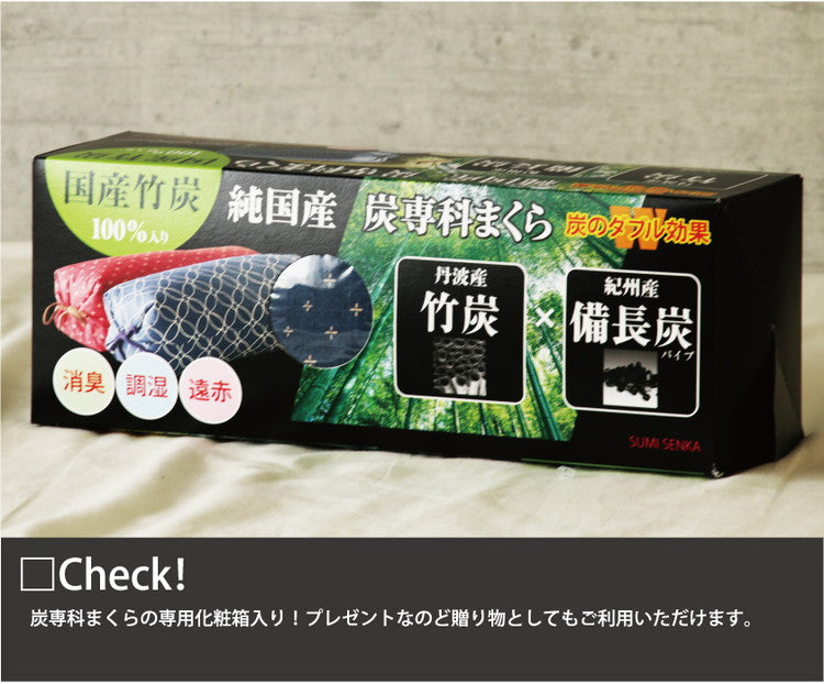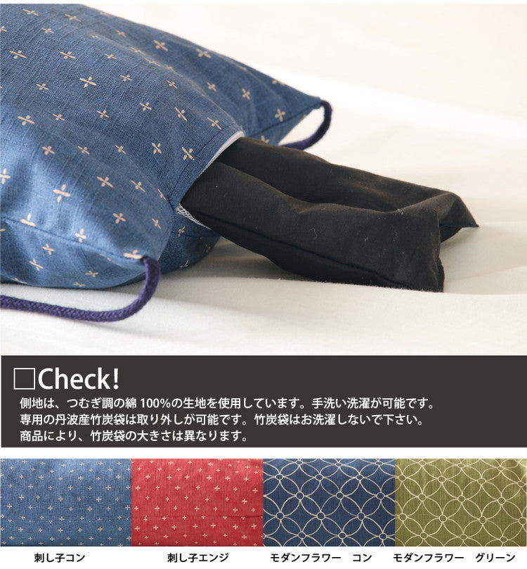 丹波産の竹炭と紀州産の備長炭パイプを使用した日本製まくら、炭専科枕。2つの炭のダブルパワーで快適な眠りをお届けします。紐の縛り具合で高さを調整できるので、お好みに合わせて高め・低めに変形できます。側地にはつむぎ調の綿100%生地を使用しており、手洗いでお洗濯ができます。