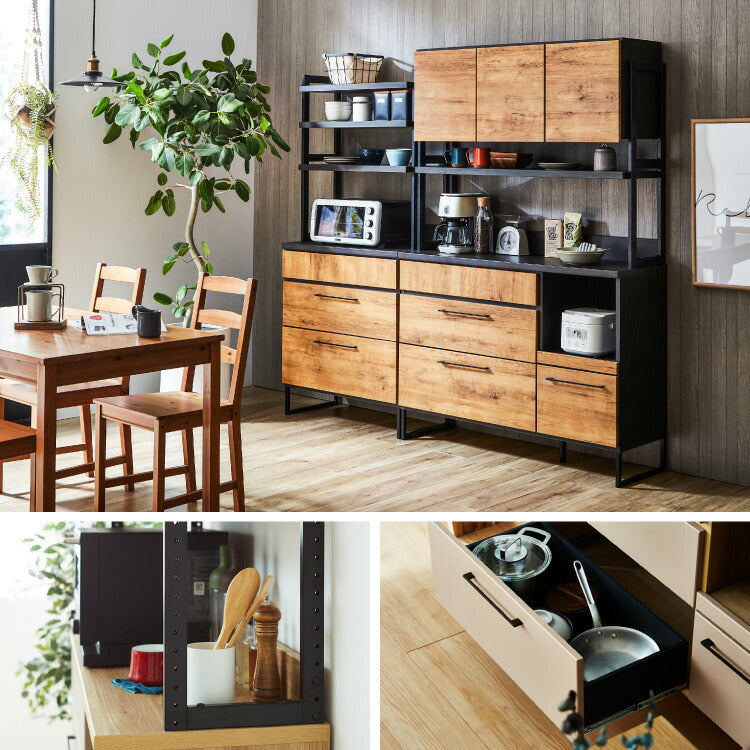 ヴィンテージ調の木目調とブラックの組み合わせがおしゃれな食器棚。