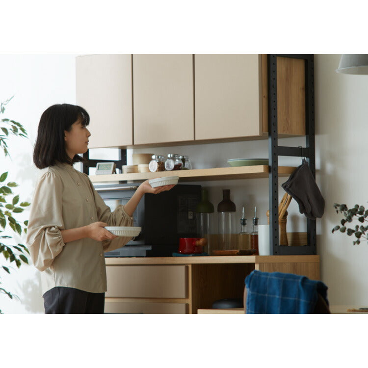 使う人に合わせてキャビネットの棚板部分を高さ調整することができます。大型のレンジも設置できます。