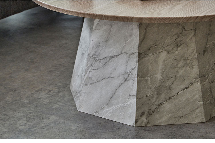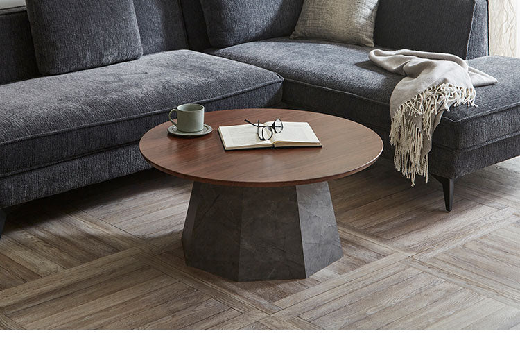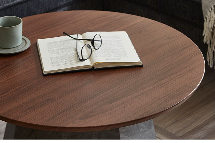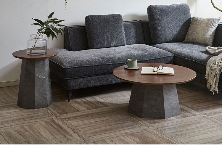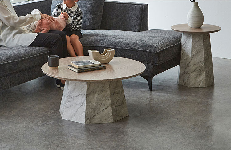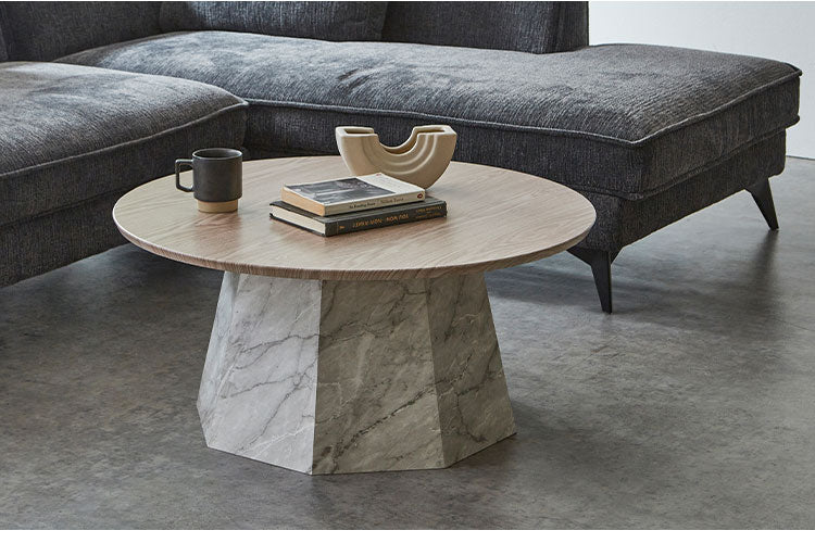 円形テーブルはソファの形に問わず、レイアウトが自由に調整しやすくオシャレに演出
