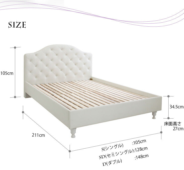 【サイズ】高さ105cm・長さ211cm・幅Sサイズ105cm:SDサイズ128cm:Dサイズ148cm・床面サイズ 高さ27cm。【重量】約66kg【素材】フレーム-合成皮革張り 脚部-ラバーウッド無垢 床板-スノコ仕様 ポプラ天然木