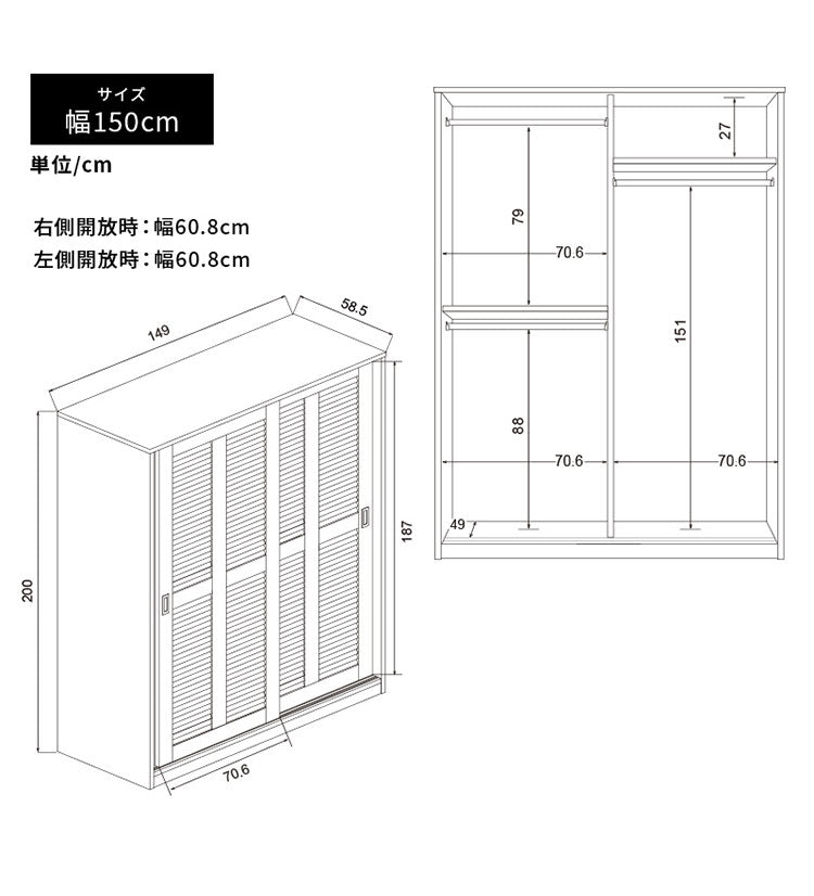 大容量ワードローブ 幅150cm クローゼット ルーバー扉 壁面収納 衣類収納 ワードローブ クローゼット ハンガーラック 衣類 洋服 収納 引き戸 扉 おしゃれ ルーバー 棚板 壁面収納 衣類収納(代引不可)