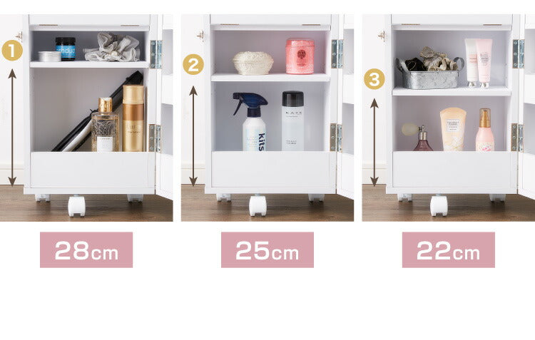 キャスター付きで移動も楽々です。背の高いスプレー缶やボトル類もすっきり収納できます。