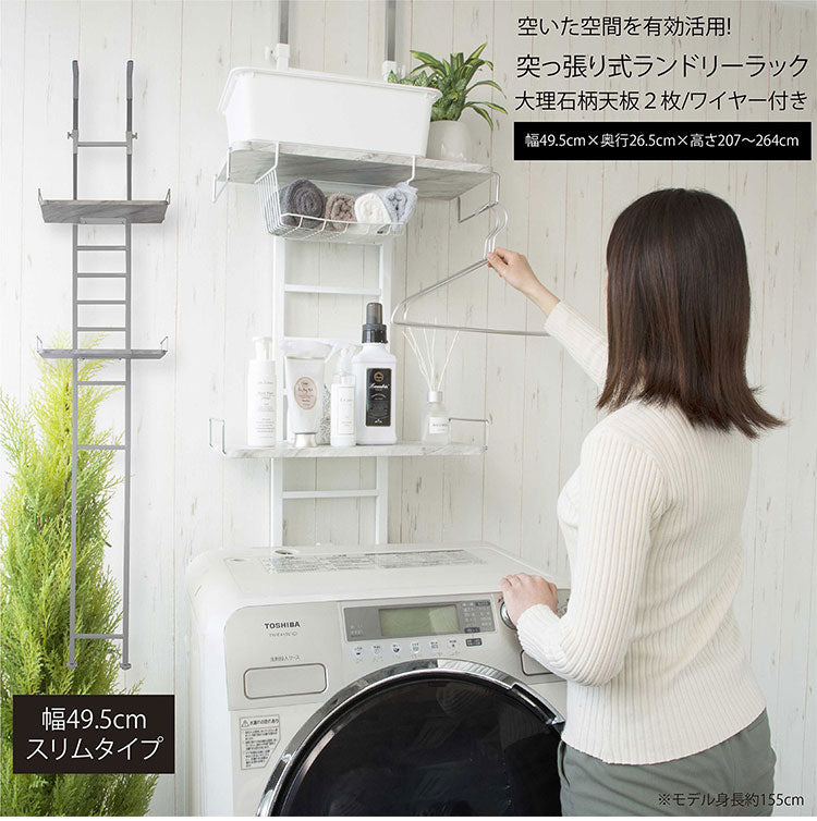 伸縮 突っ張りランドリーラック 大理石柄 2枚 ワイヤー付き バスケット 防水パン対応 突っ張り 突っ張り式ランドリーラック バスケット カゴ 洗濯 洗濯機 ラック ランドリー収納 洗面所 フラット棚(代引不可)