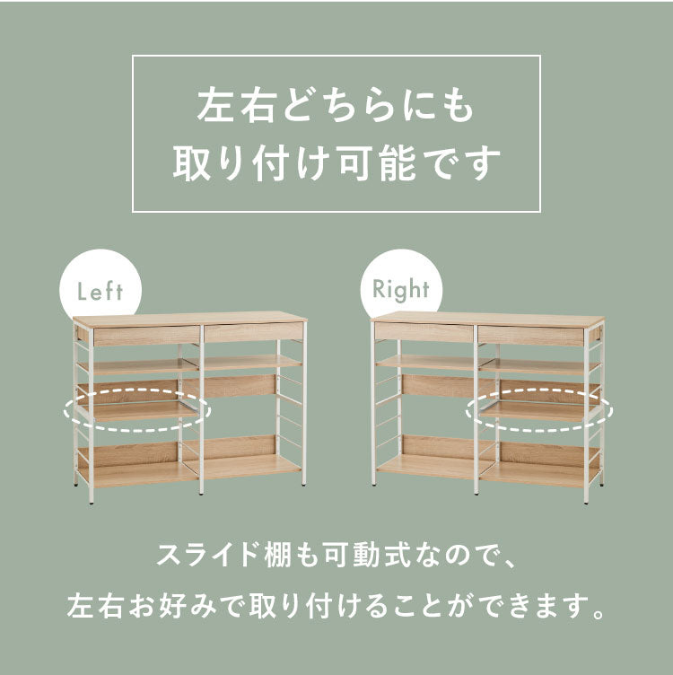 120cm幅の天板で調理スペースとしても快適にお使いいただけ、家事の効率をアップ。 ゴミ箱スペース横の収納は、全段に可動棚を採用。食器・調理器具・キッチン家電・食品ストックなど幅広い収納物に柔軟に対応いたします。