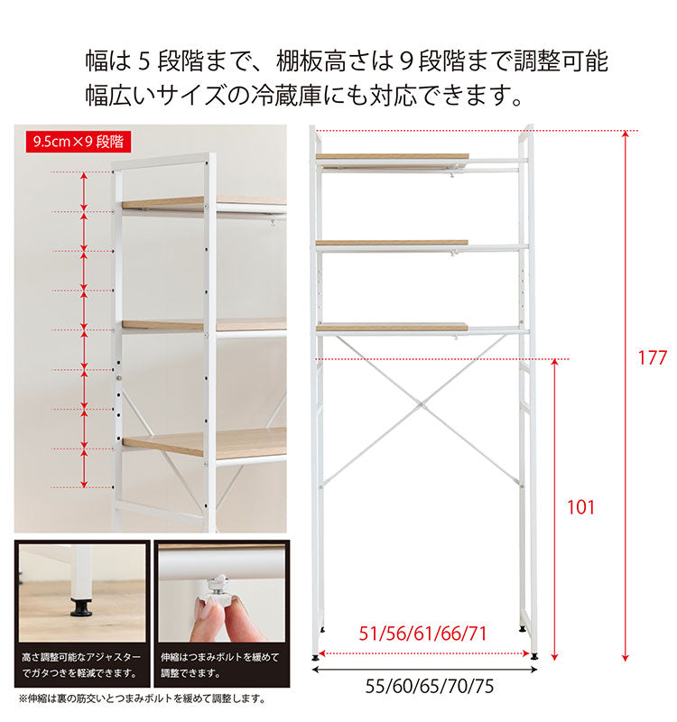 ・幅が55~75cm(5cm間隔)の5段階に調整できる伸縮式の冷蔵庫ラックです。