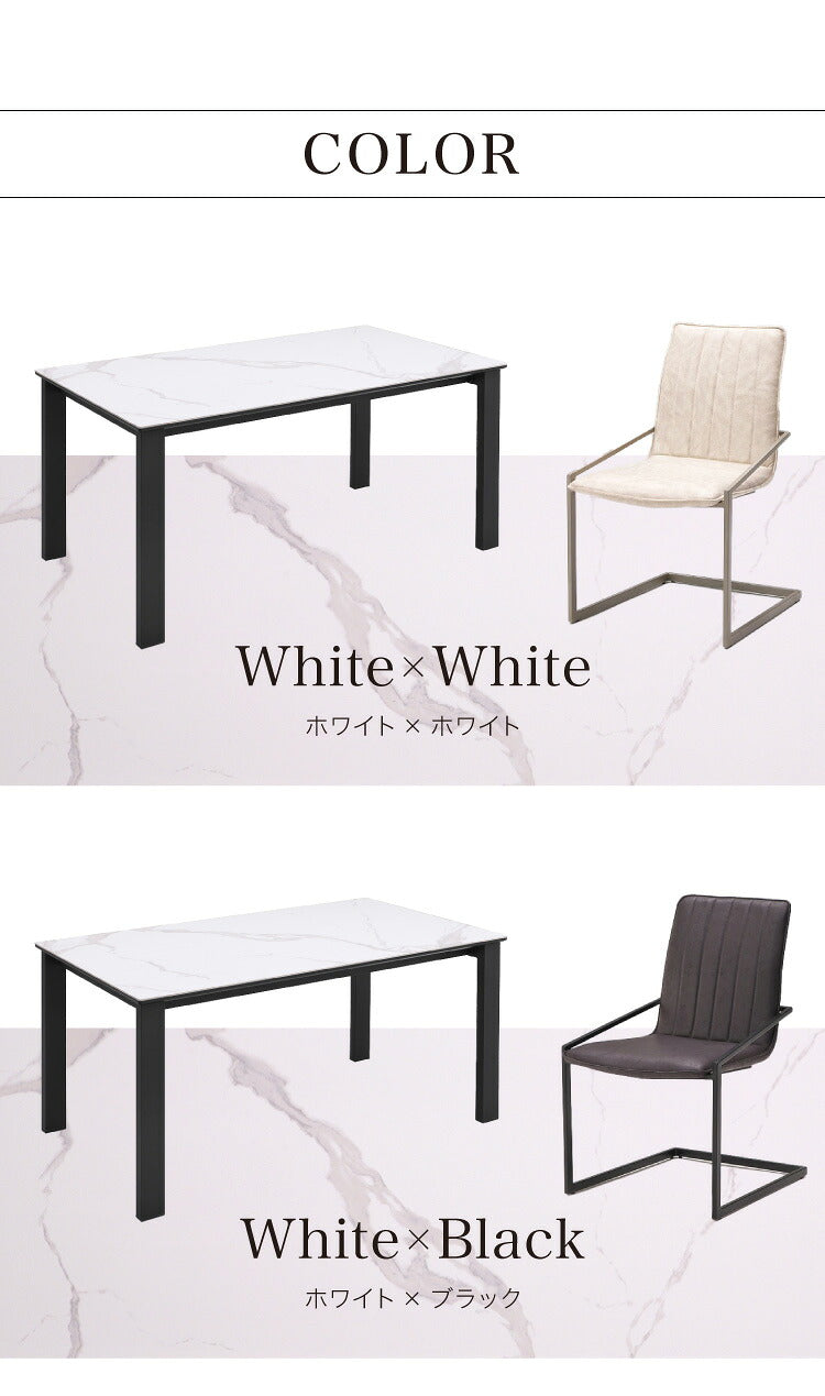 テーブルはデザイン性ある石目の鏡面セラミック天板採用。チェアは背中を包み込みふっくらした座り心地、流行のカンティレバーチェアでダイニングシーンを演出。