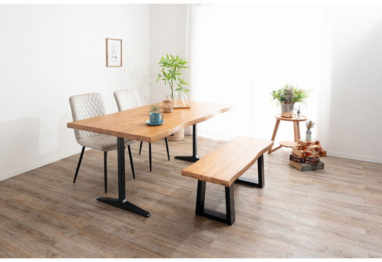 オーク無垢を使用した重厚感のある40mm厚天板。シンプルながらもデザイン性・耐久性のあるスチール製脚。木口も耳付き加工を施し、木本来の自然な風合いと温かみのある空間を演出できるダイニングテーブル。