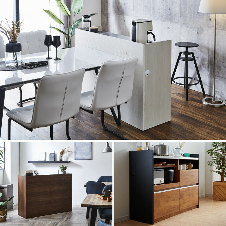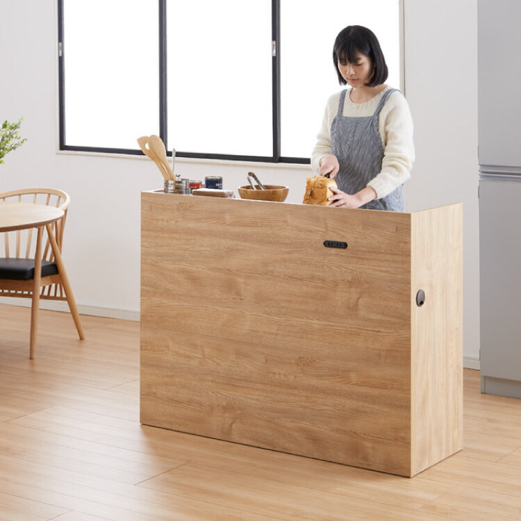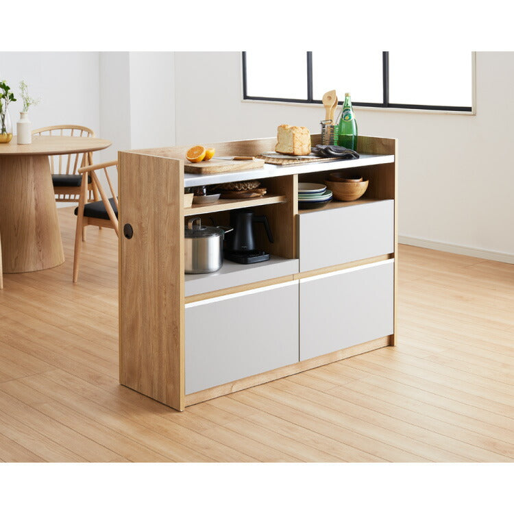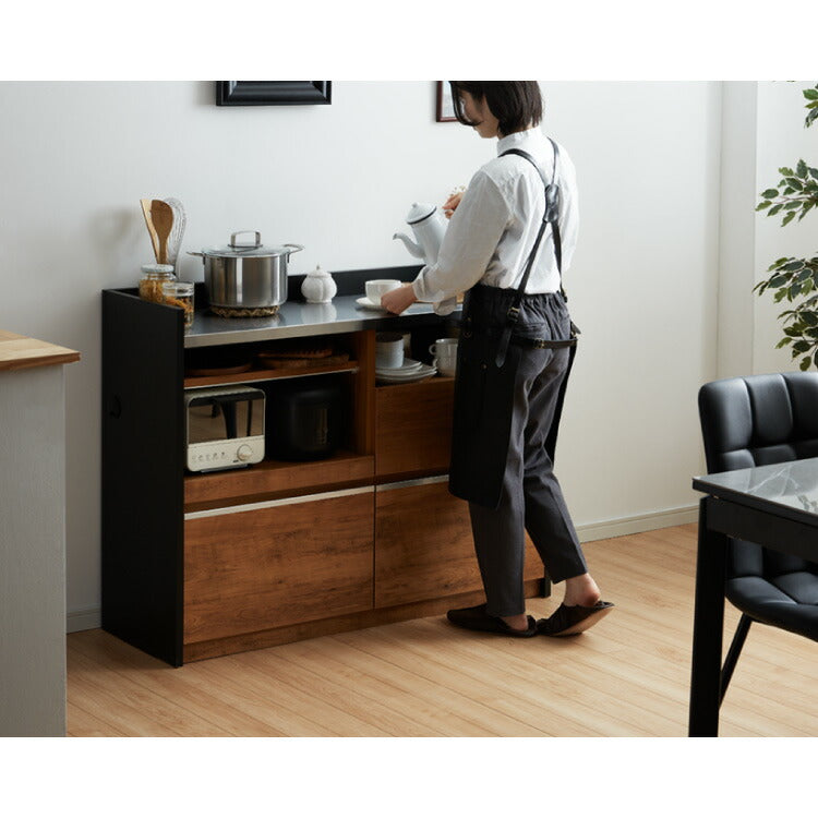 手元を隠す キッチンカウンター 間仕切り 完成品 幅120 ステンレス天板 モイス加工 スライド棚 耐水 耐熱 コンセント付き 引き出し 食器棚 キッチンボード グレー オーク ブラウン(代引不可)