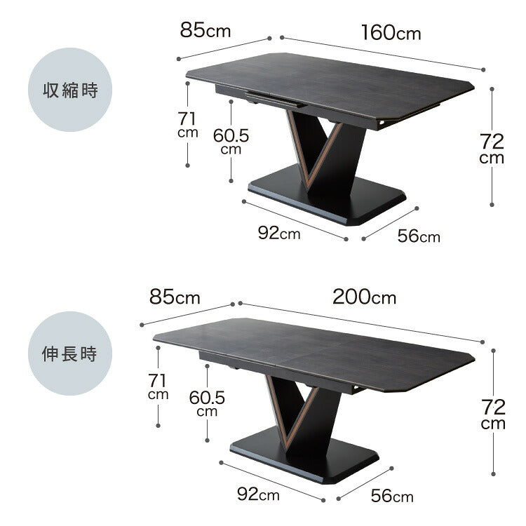 人数やお部屋に合わせ160cmまたは200mで使用可能な伸長テーブル。デザイン性ある石目のセラミック天板を採用。
