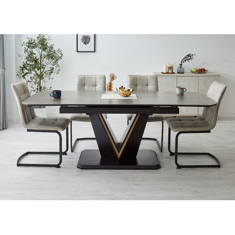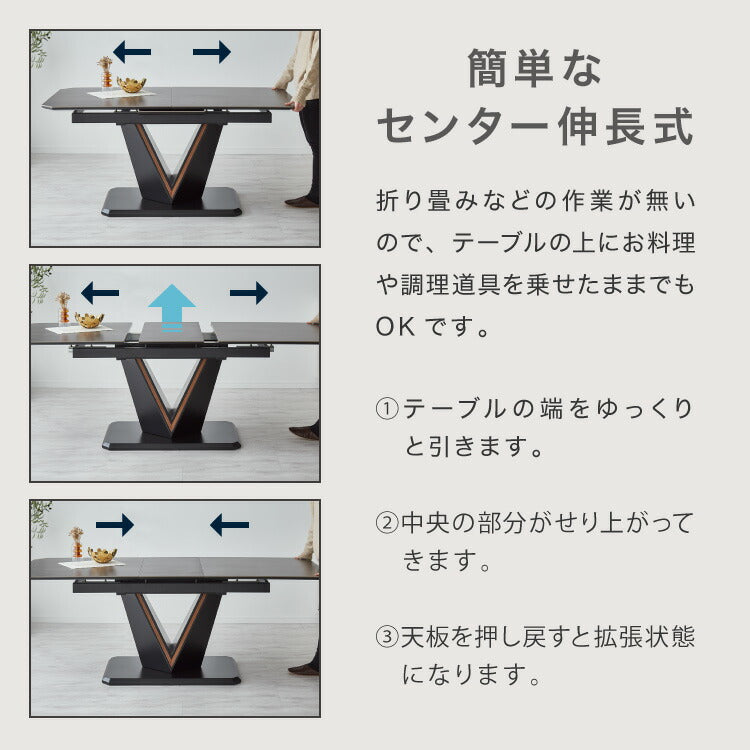人数やお部屋に合わせ160cmまたは200mで使用可能な伸長テーブル。デザイン性ある石目のセラミック天板を採用。