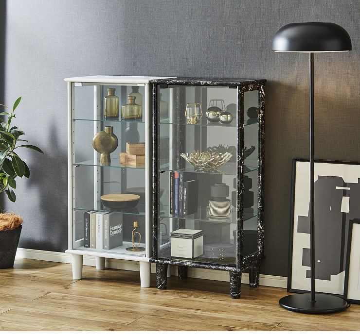 ・高さ調整ができる可動式のガラス棚。飾るものに合わせて自由なレイアウトが楽しめます。