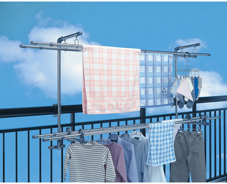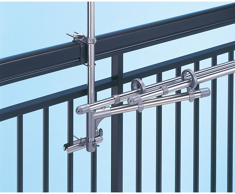格子てすりにしっかり取付け、足もとをスッキリ使えるものほし台です。