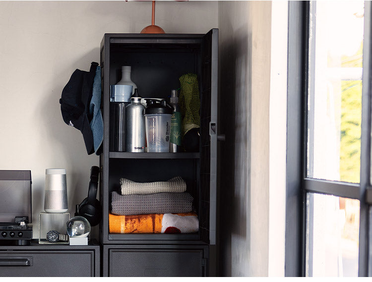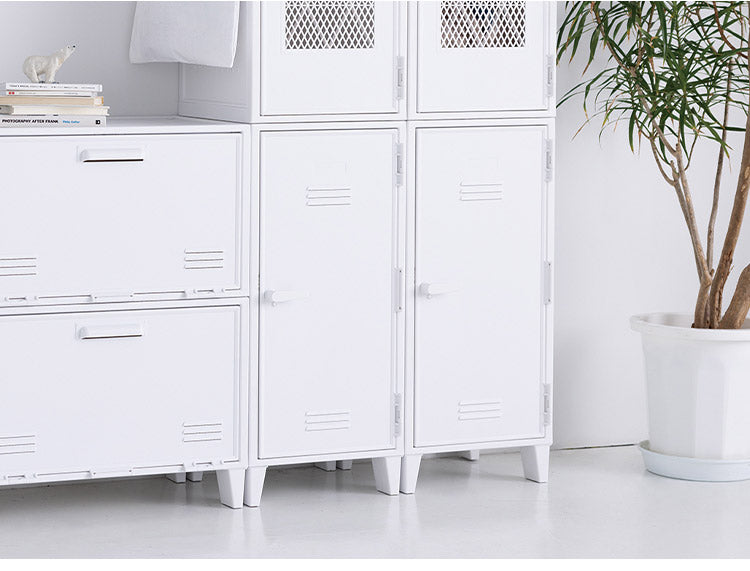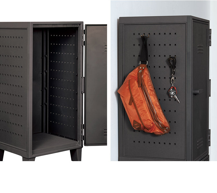 側面にペグボードが付いた飾れるロッカー型キャビネット収納。