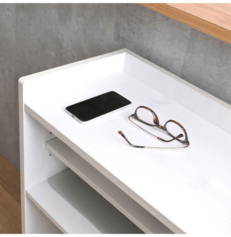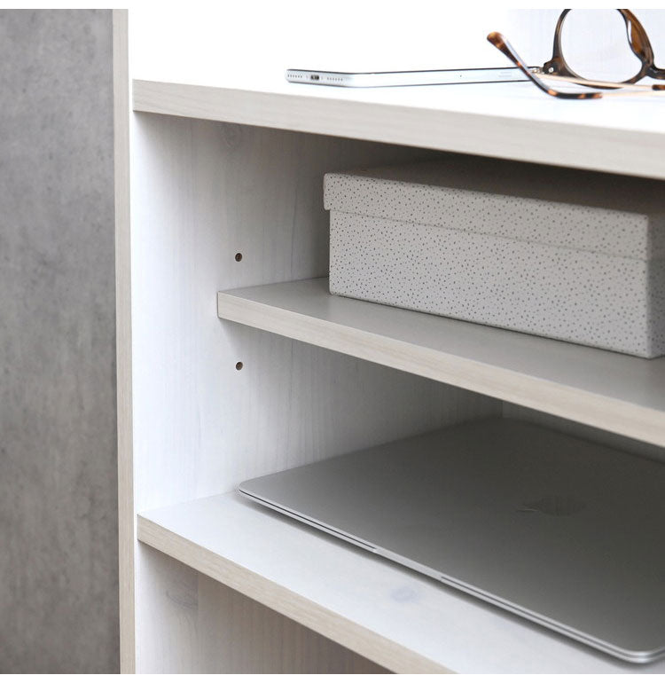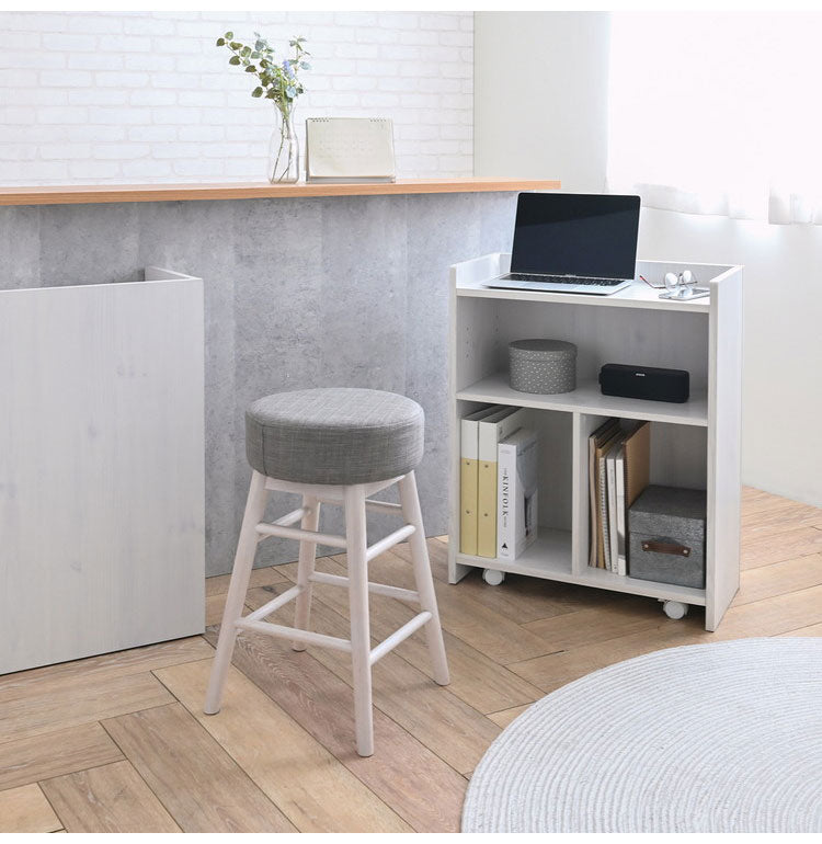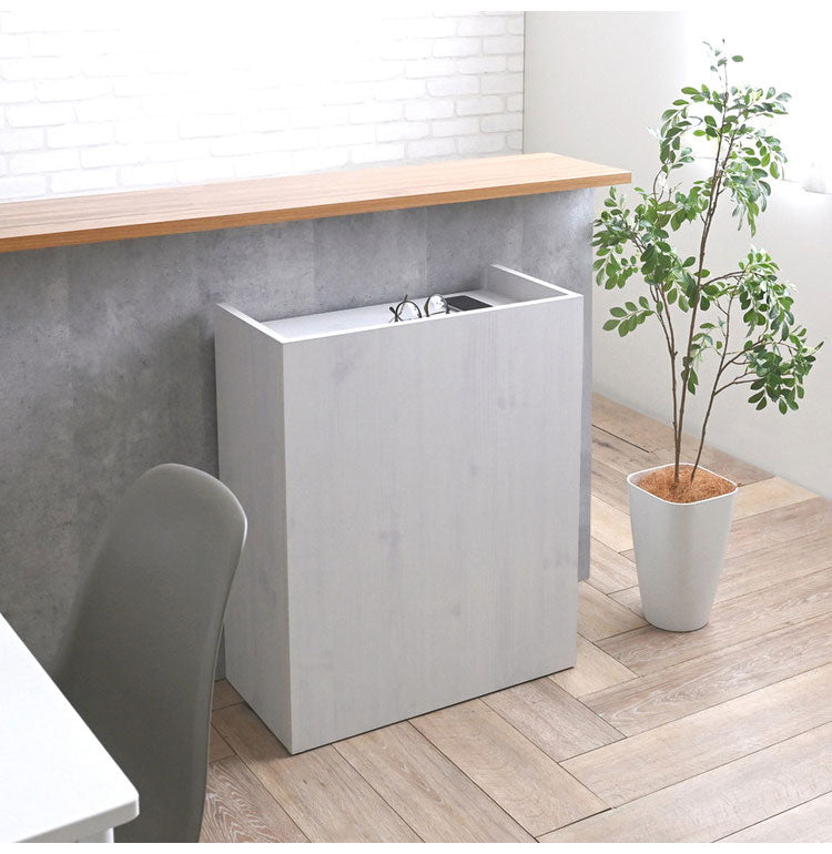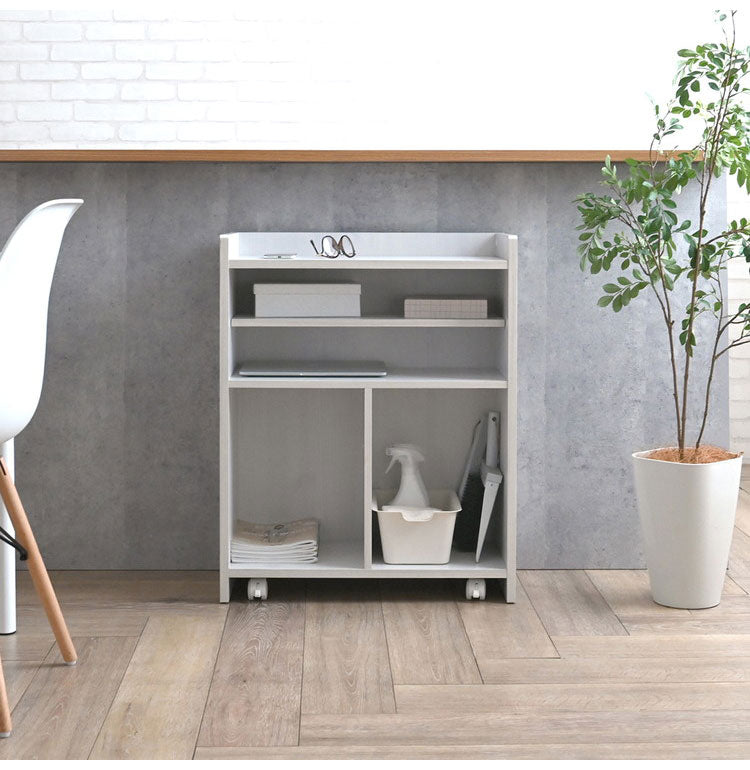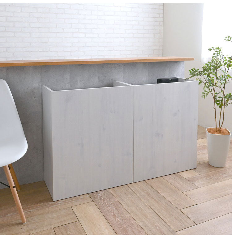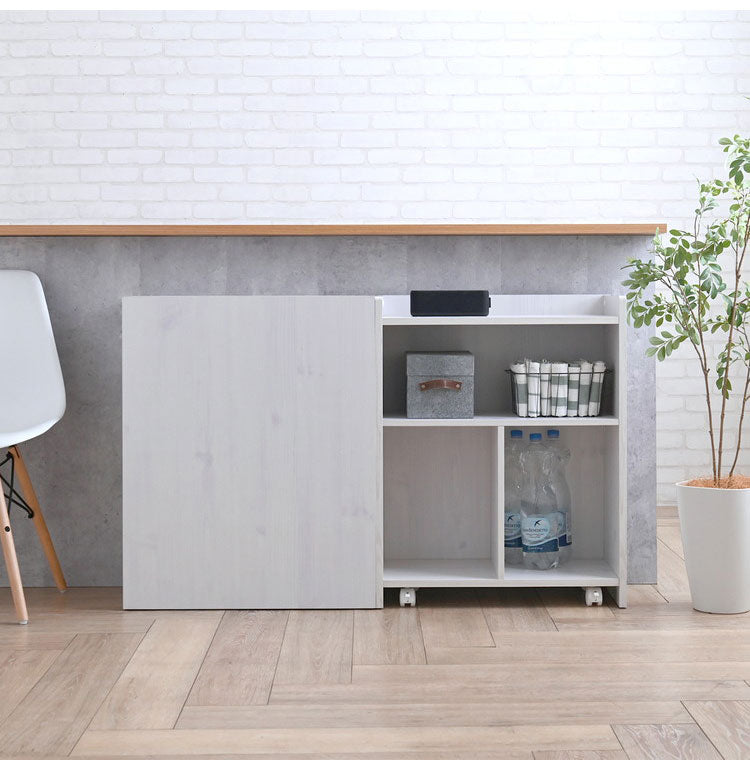 隠しキャスター付ですっきりと収納できるカウンター下収納です。生活雑貨やA4ファイル、背の高いアイテムなども収納することができます。クルッと回転させることで生活感を隠すことができ、お部屋を綺麗に見せてくれます。木目調がきれいな背面化粧になっているので間仕切り家具としても使うことができ、様々なシーンでマルチに活躍します。