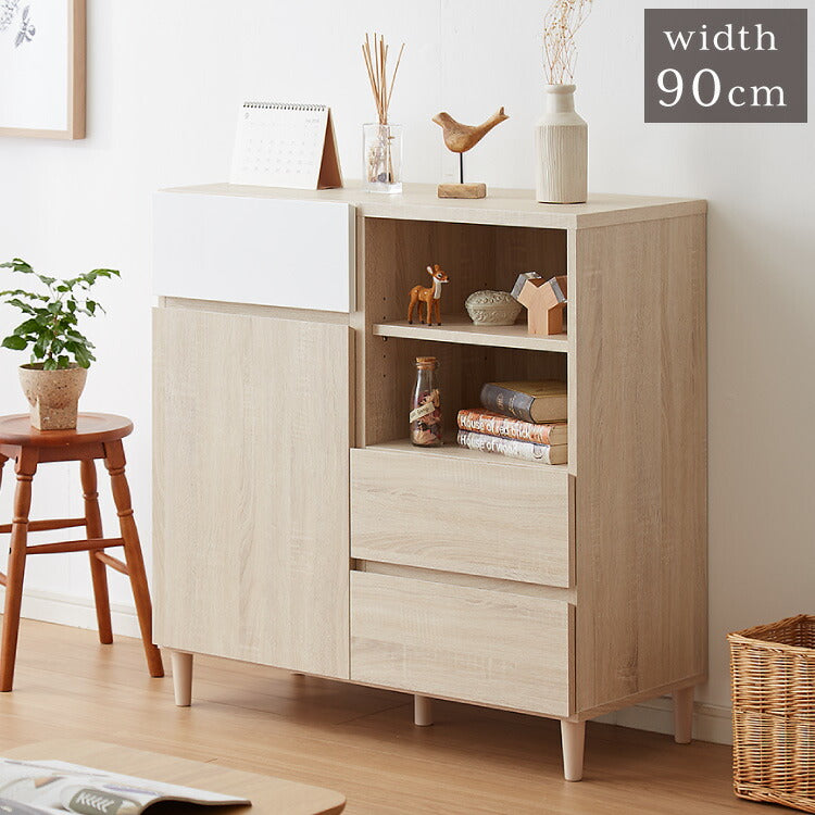 キャビネット 幅90 リビングボード 大容量 収納キャビネット 鏡面 白 木製 ツートン ホワイト 収納 引き出し リビング収納 チェスト ディスプレイ シンプル 北欧 おしゃれ HELM ヘルム(代引不可)